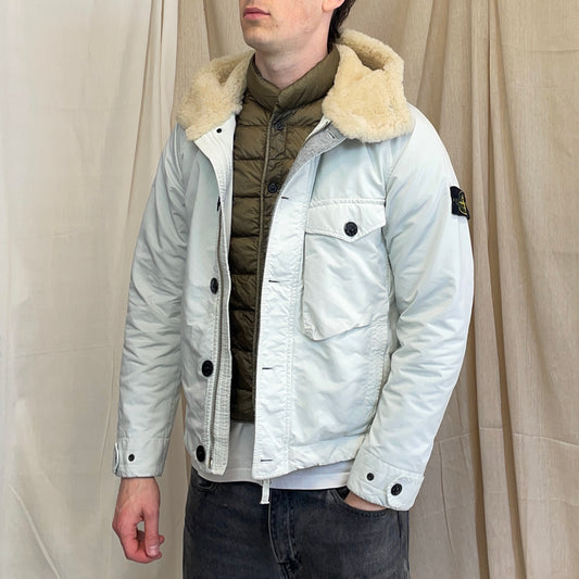 Stone Island White AW17 David-TC Sheep Leather Sheerling Hood Down Puffer Lined Jacket