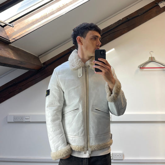 Stone Island White AW06 Shearling Sheepskin Hand-Painted Leather Archive Jacket