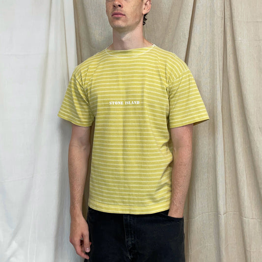 Stone Island Yellow 80s Striped Boat Neck Cotton Spellout TeeRegular price £175.00 GBPRegular priceUnit price / per-