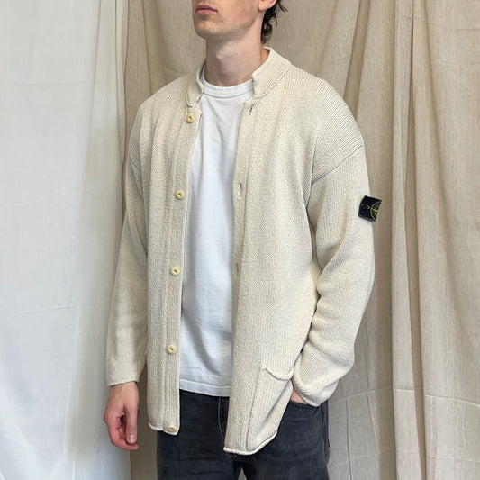 Stone Island Cream SS95 Silk Linen Button-Through Green Edge Badge Knit Cardigan Jumper