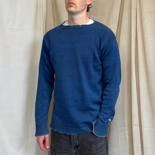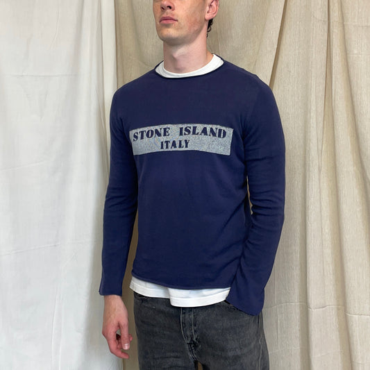 Stone Island Navy 00s 'Italy' Lightweight Raw-Edge Spellout Knit Jumper