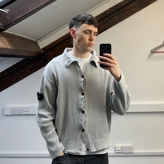 Stone Island Grey SS99 Chenille Knit Button-Through Green Edge Badge Cardigan Jacket
