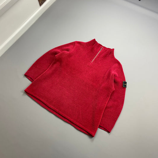 Stone Island Red 90s Chenille Knit Half-Zip Green Edge Badge Jumper