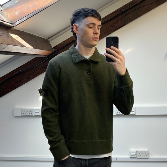 Stone Island Green AW06 Fine-Rib Wool Knit Button Collar Jumper