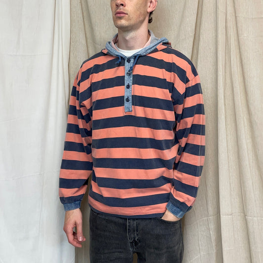 Armani Jeans Peach & Stone Grey 90s Canvas Cotton Hooded 'Stone Stripes' Pullover Jumper