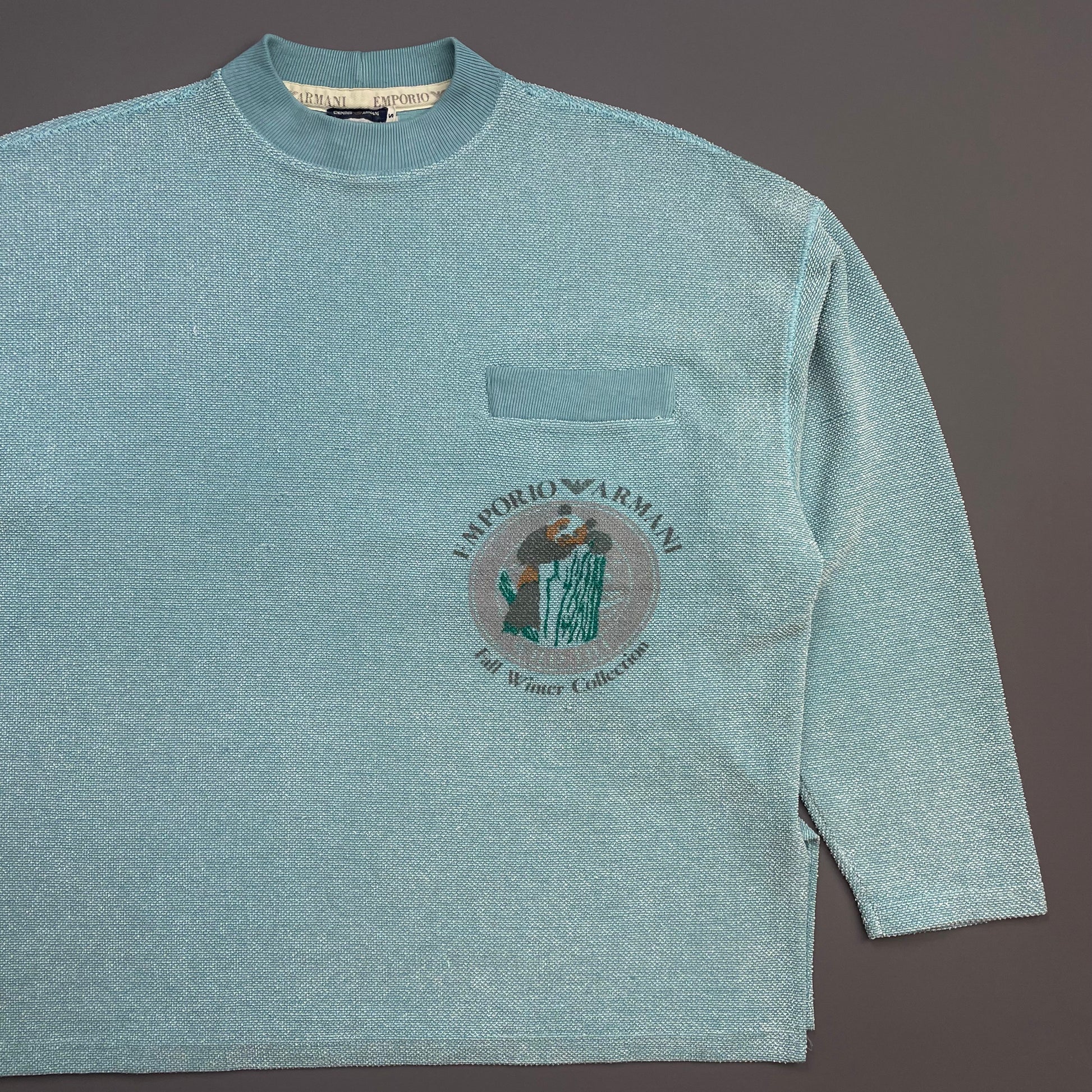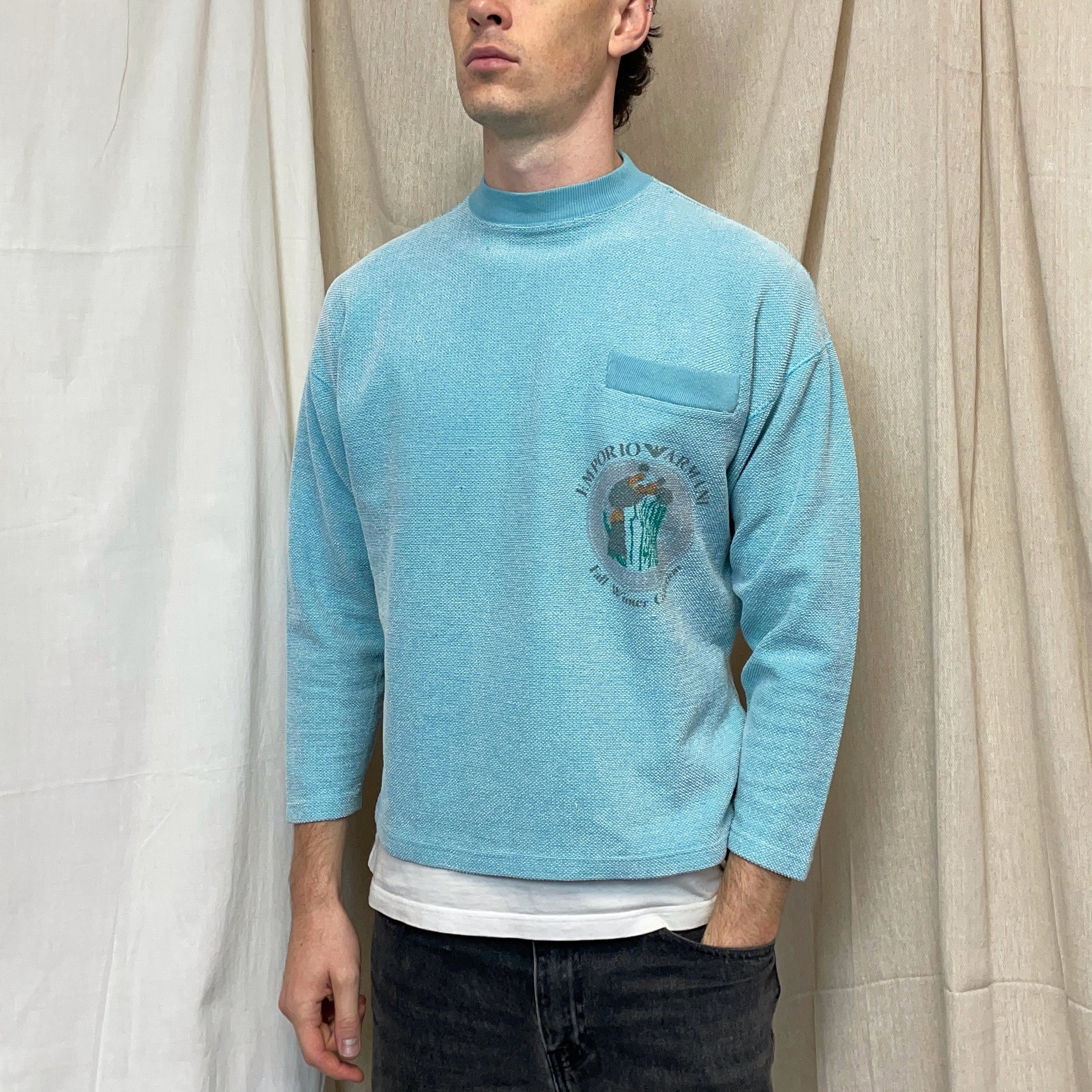 Emporio Armani Teal Blue 80s Graphic Print Lightweight Pocket Jumper